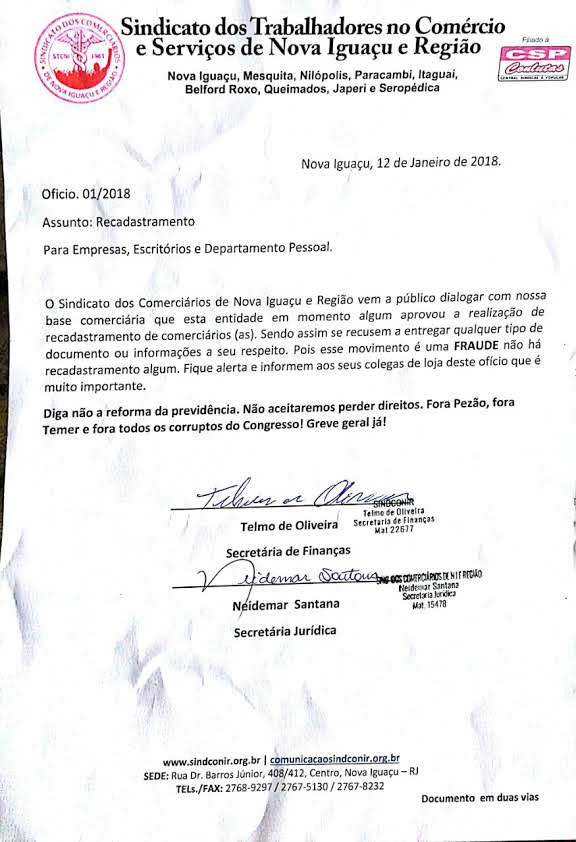 Não há no momento nenhum recadastramento sendo feito pelo Sindicato dos Comerciários. Recadastramento nesse momento é FRAUDE. Comerciárias e Comerciários não dê informações ou documentos para recadastramento nesse momento.