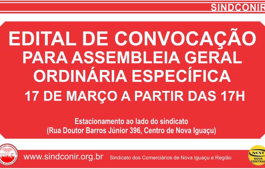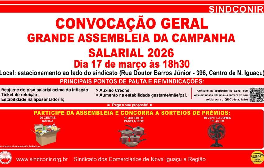 Convocação GeralGrande Assembleia da Campanha Salarial 2026Chegou a hora! Vamos lotar o estacionamento ao lado do sindicato e participar desse momento histórico.Traga sua proposta e venha construir uma Campanha Salarial Vitoriosa!17 de marçoA partir das 18h30Rua Doutor Barros Júnior, 396, Centro de Nova Iguaçu…