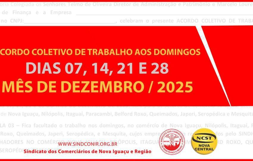 Confira abaixo, os documentos do Acordo Coletivo de Trabalho aos domingos, nos dias: 07, 14, 21 e 28 do mês de Dezembro de 2025. O acordo assinado, a listagem dos funcionários e comprovante de pagamento, devem ser enviados para os e-mails do financeiro@sindconir.org.br e luciana.guedes@sindconir.org.br Preenchimento: As empresas interessadas em funcionar nos domingos de…